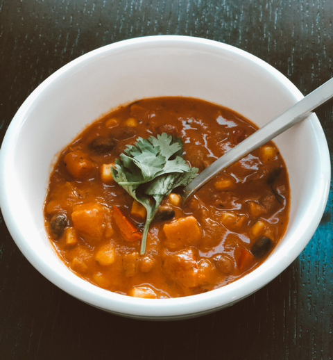 4. Add the pumpkin, diced tomatoes, drained beans, corn and vegetable broth.